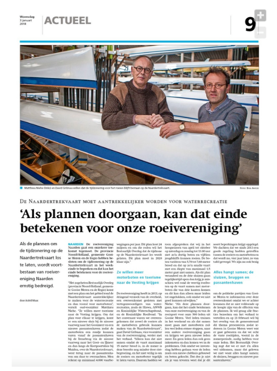 Gevaar voor botsingen Matthieu Niehe, Vaartcommissaris van Roeivereniging Naarden: āWe hebben hier te maken met een onbetrouwbare overheid. In 2013 hebben wij op hun verzoek een overeenkomst gesloten met onder meer het Koninklijke Nederlandse Watersport Verbond en de Hiswa als toekomstige gebruikers. Dit omdat de ⬠24 miljoen kostende plannen van de Provincie Noord-Holland en de Gemeente Gooise Meren zonder zoān afspraak ernstige gevolgen hebben voor onze Roeivereniging. Motorboten die maximaal 6 km per uur varen en roeiboten die de 18 km per uur kunnen halen op een smalle vaart: dat gaat niet samen. Met die overeenkomst konden de leden van onze vereniging voldoende ongestoord op de Naardertrekvaart blijven roeien, zoals we dat al 65 jaar doen. Vooral in de weekenden varen wij tot ongeveer 13.00 uur met wel 40 boten variĆ«rend van 5,70 tot 7,30 meter breed op een vaart van 15 meter breed. Je moet er niet aan denken dat er dan ook nog motorboten tussendoor gaan varen. Dat kan alleen maar leiden totĀ ongelukken.ā